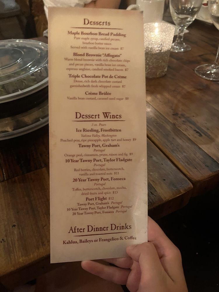 Warm blond brownie with chocolate chips and pecans, espresso anglaise, vanilla ice cream, candied smoked bacon